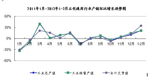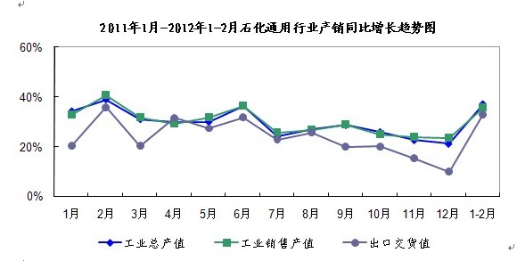 2012年2月,全國石化通用行業(yè)完成工業(yè)總產(chǎn)值1,128.23億元,同比增長37.12%,環(huán)比增長22.61%;完成銷售產(chǎn)值1,078.99億元,同比增長35.8%,環(huán)比增長21.56%。