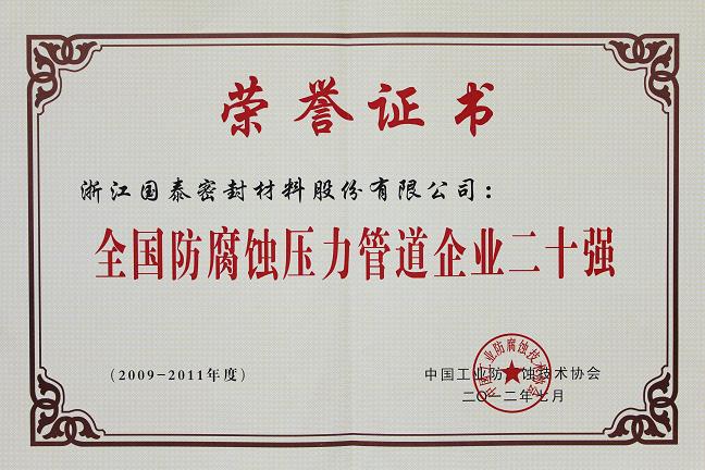 國泰密封榮獲“2009-2011年度全國防腐蝕行業20強企業”(綜合排名第七)和“2009-2011年度全國防腐蝕壓力管道企業20強”(綜合排名第二)兩項榮譽。