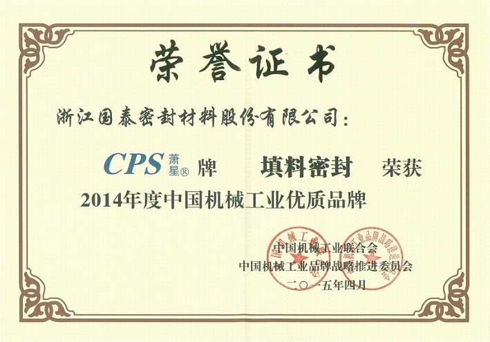 近日,由中國機械工業聯合會舉辦的2015 年全國機械工業品牌戰略推進工作會議在京召開。浙江國泰密封材料股份有限公司的CPS蕭星牌填料密封產品不負眾望,榮獲全國填料靜密封行業首個“中國機械工業優質品牌”表彰。