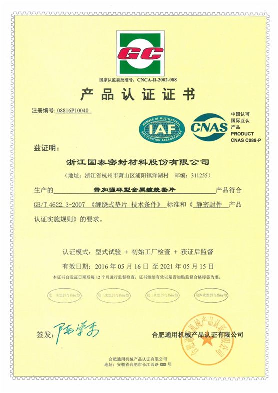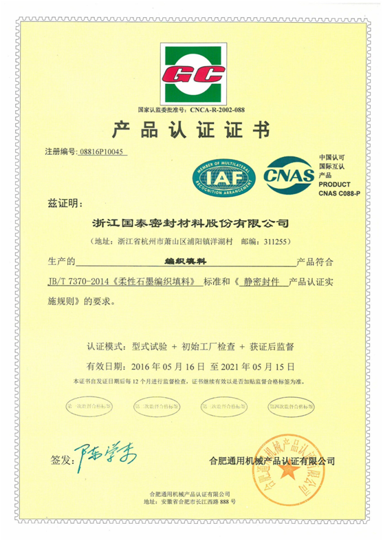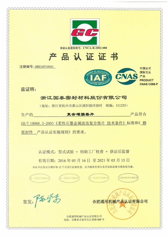 近日,我司收到合肥通用機(jī)械產(chǎn)品認(rèn)證有限公司的通告和寄來的密封件產(chǎn)品GC認(rèn)證證書,標(biāo)志著我司產(chǎn)品質(zhì)量符合相應(yīng)標(biāo)準(zhǔn),可獲得和使用GC認(rèn)證標(biāo)志及認(rèn)證證書。證書共8份,分別對應(yīng)以下產(chǎn)品:(1)基本型金屬纏繞墊片;(2)帶加強(qiáng)環(huán)型金屬纏繞墊片;(3)復(fù)合增強(qiáng)墊片;(4)非金屬平墊片;(5)金屬墊片;(6)柔性石墨墊(板);(7)編織填料;(8)模壓填料 。